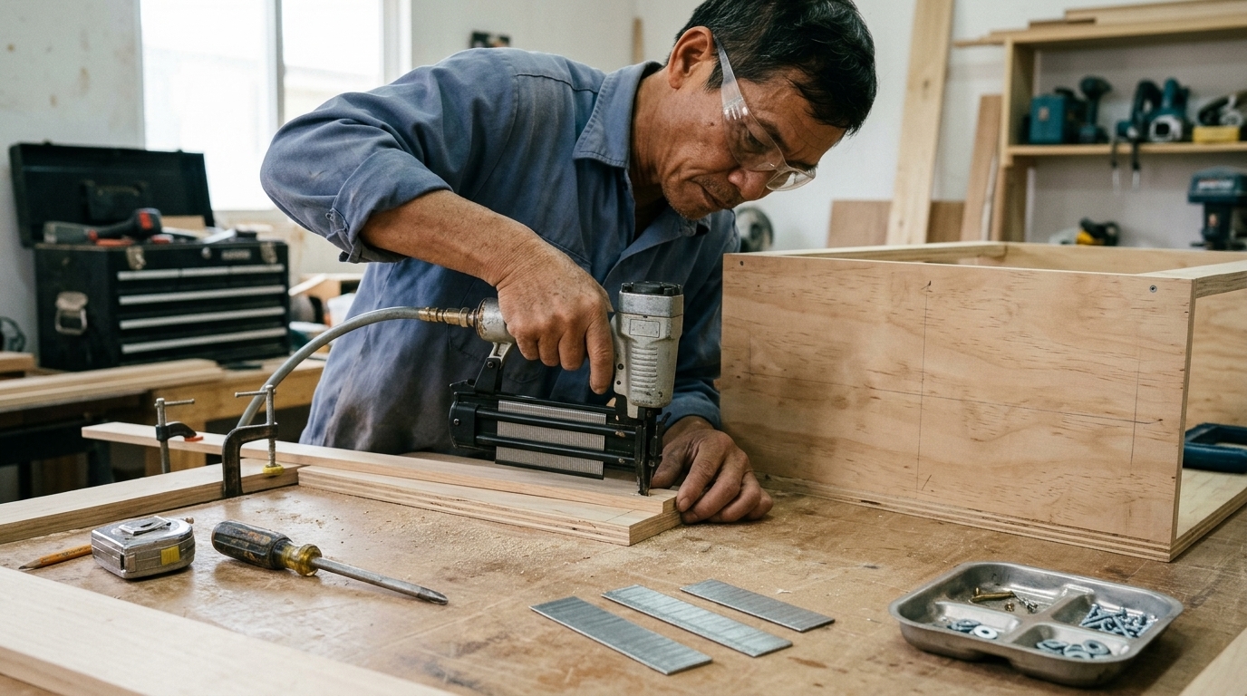 Với xưởng nội thất, nên để sẵn vài cỡ hay dùng. Khi thợ đang làm mà thiếu đúng cỡ đinh thì khá mất thời gian, nhất là những đơn hàng cần ra nhanh.